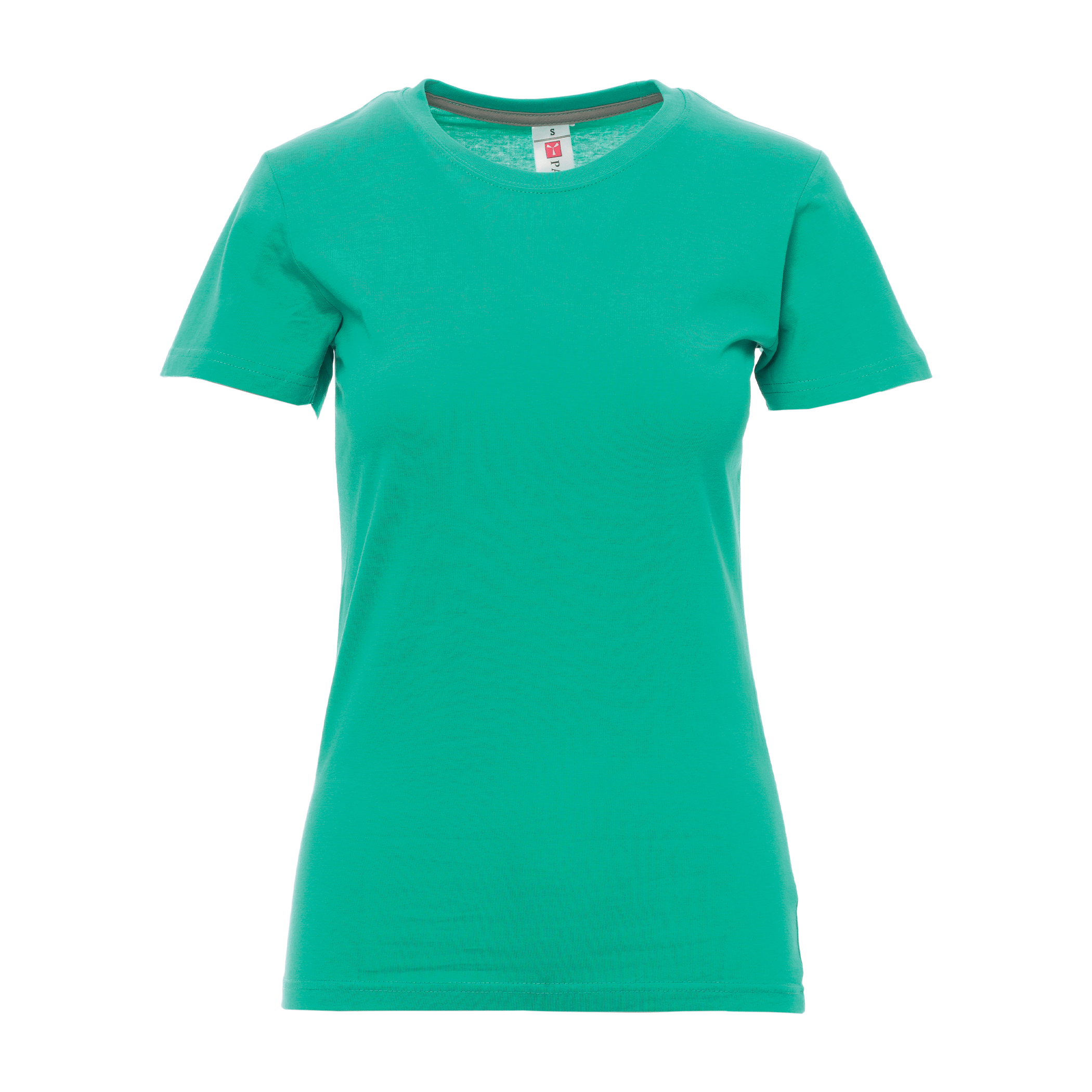 Tee-shirt cintré pour femme, encolure ras le cou et manches courtes, col en bord côtes mixte spandex de 1,5 cm avec couture rabattue sur le devant, ruban de renfort d’épaule à épaule dans couleur en contraste sur le col, coutures stretch, couture latérale.
